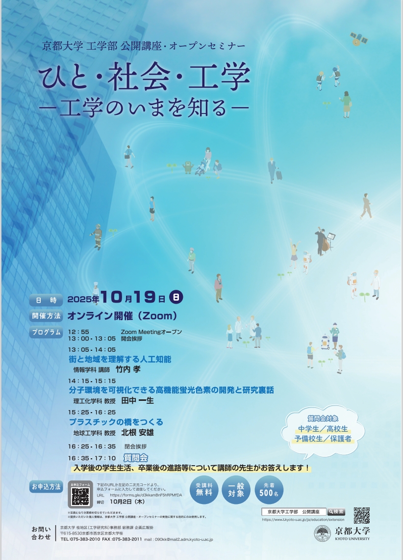 下記、ボタンをクリックすると専用フォーム(Google Form)が開きます。必要項目を入力の上、「送信」ボタンを押してください。 ※モバイルやパソコンに受信拒否設定をされている方は、必ず受信拒否設定を解除、または『090kk@mail2.adm.kyoto-u.ac.jp』を受信リストに加えてからお申込みください。 ※開催が近づきましたら(開催3日前予定)、受付を完了している方を対象にご登録のメールアドレスへ当日の参加方法等のご案内をお送りしますので、届かない場合は下記「問い合わせ先」へご連絡ください。 ※10月3日付で参加登録いただきました方に、当日の参加方法等のご案内をお送りいたしましたが、登録されたメールアドレスに不備があり、送信できていない方がいらっしゃいます。 『090kk@mail2.adm.kyoto-u.ac.jp』 ※提供いただいた個人情報は、京都大学 工学部 公開講座・オープンセミナーの実施に関する目的にのみ使用します。 |