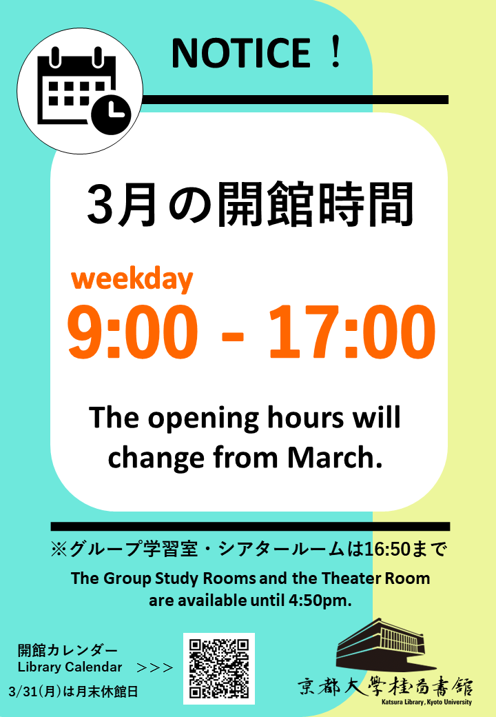 [Katsura Library] Library hours will be shortened to 9am - 5pm on weekdays in March