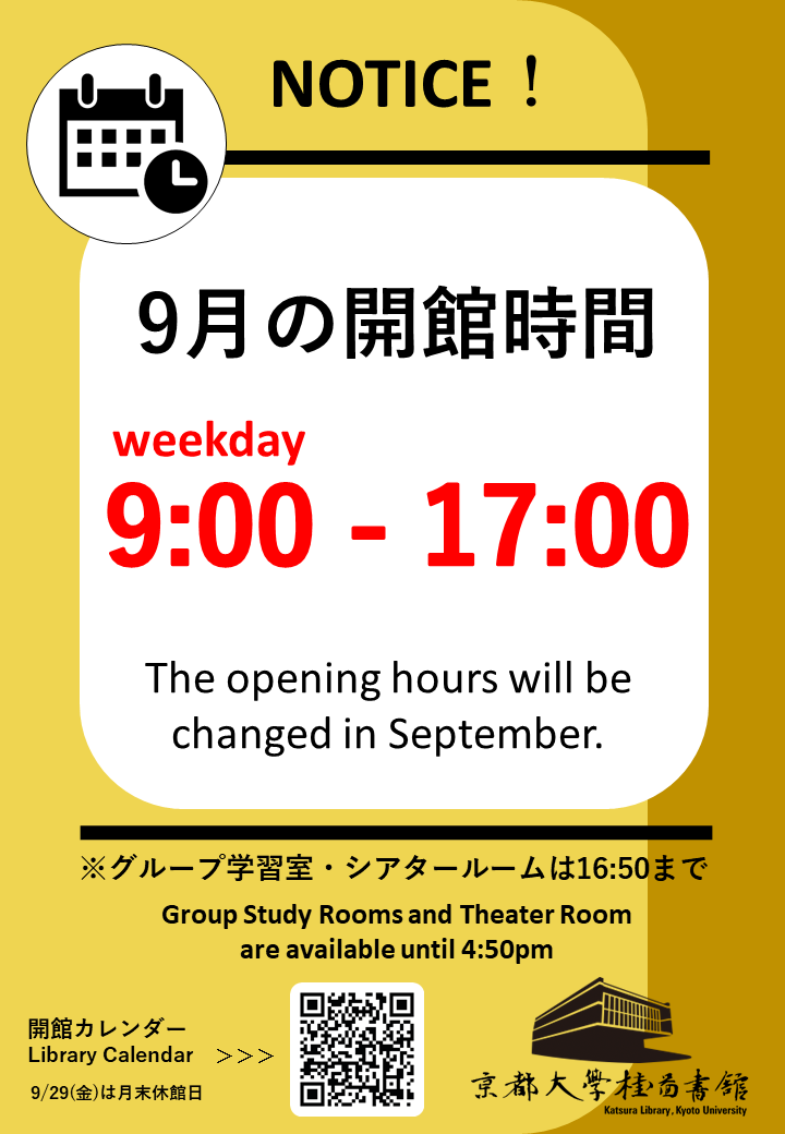 桂図書館の9月の開館時間は平日9:00-17:00となります。