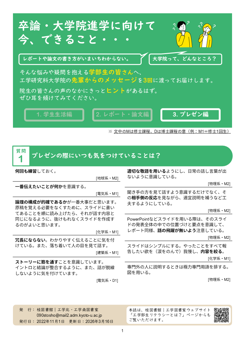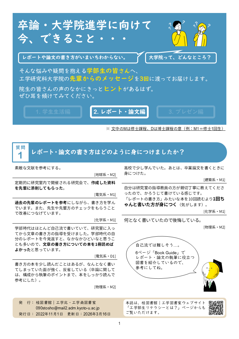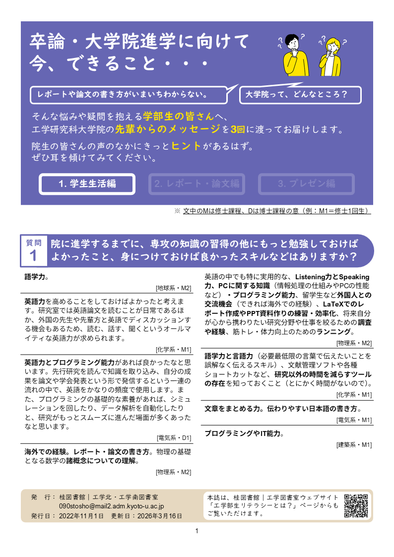卒論・大学院進学を控え、悩みや疑問を抱えている工学部学生のみなさんに向けて、桂図書館スタッフでもある工学研究科各系の大学院生にアンケートを取り、学部生時代にやっておくべきこと、身につける知識やスキルに関する先輩方の貴重なアドバイスをまとめたパンフレットを作成しました。ぜひ参考にして、有意義な学生生活を送っていただければと思います。