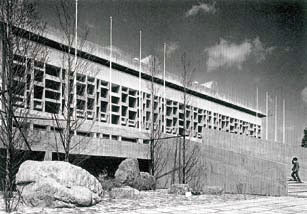 浅き春、退職を前にした私は西部構内の「京都大学総合体育館」(1972)を訪れた。前庭の白梅が二月の陽光を含んで輝いていた。先師、増田友也先生(1914-1981)の指導のもと、大学院生のときに実施設計のスタッフとして参加した作品である。京都大学創立70 周年記念事業による施設の建設であった。体育館正面(図1)の石庭の石は卒業生からの寄贈による。信州・天竜川、四国・吉野川などから多くの石が寄せられた。石組みの配置は師の現場における直接の指図による。体育館が竣工したときに、当時の教養学部(現在の総合人間学部)のドイツ文学者、佐野利勝先生(マックス・ピカート著『沈黙の世界』の訳者)が「京大の顔」が出現した、と慶ばれたことを風のうわさに聴いた。