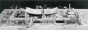 「京都大学総合体育館」の、基壇(屋上庭園)と庭(中庭)とによる空間構成には、実は、長い前史がある。この施設は「計画案・京大会館」(1964-69)の縮小案として成立したのである。原案のうちの体育施設のみが実現され、学生と教職員のための福祉・文化施設は除かれたのである。「京大会館」の全体計画の詳細については書くスペースがないが、その概要は、中央に置かれた体育館と音楽ホールの周囲を、学生と教職員のための諸施設が、大小の内庭を蔵しつつ包囲するという構成であった。四周を包囲する諸施設の屋上は庭園として開放され、東大路を渡るブリッジによって本部構内(西部構内との間に一層分のレベル差がある)と結ばれていた。本部構内から見れば、屋上庭園は、広大なエントランスの庭園とみなせる(図2)。西部構内全体をめぐる屋上庭園は、いわば空へのファサードであり、一方、地上に織り込まれた名もない中庭群は親密な人間の場所となる。現存する総合体育館南側の部室棟前の中庭(石が配される)、北側の坪庭(竹林が計画されていた)のモチーフは、原案の中庭に由来する。