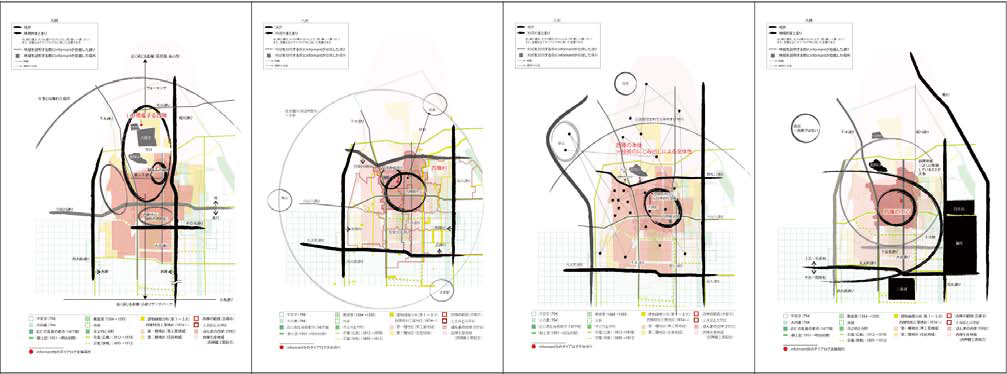 これまでのフィールドは京都・西陣地域とインドネシア・ジャカルタです。西陣織で有名な都市内産業地域である西陣はその産業縮小に伴って街並みが大きく変化してきました。実際の産業の担い手である居住者らとの描画対話法を通して,平安期以降の市街地形成過程や職人の生業や経験によって裏付けられた時空間的な価値づけ領域が得られました(fig.1)。