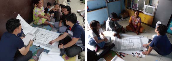 ジャカルタでは行政によって強制立ち退きに遭い現在シェルターに暮らす都市集落(Kampung Akuarium)の居住者らと対話し(pic.1),彼らが思い描くミクロな価値づけ領域である「自地域」の姿を明らかにしました。描画対話法によって一見無秩序にも見えるような風景も,実は居住者が「自地域」への貢献しようと手を加えた結果であったり(pic.2左),コミュニティ内でしっかりと管理されていたり(pic.2 右),自律的な秩序を見出すことが出来ました。つまり,スラムとレッテルを張られていた都市集落におけるダイナミックな自己組織化の仕組みを解明する糸口が示されたのです(pic.3)。