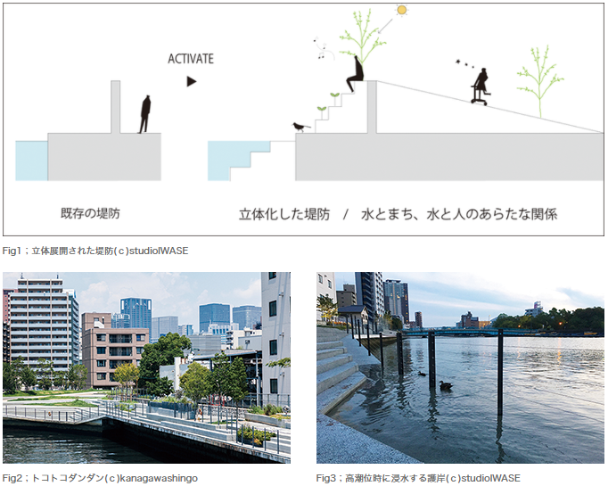たとえば,筆者が設計に携わり2017年に竣工した《トコトコダンダン2017》は大阪の市街地を流れる木津川沿いの堤防のデザインである。水害からまちや人の暮らしを守ることが至上命題である堤防に対してデザインという言葉は不釣り合いのように聞こえるかもしれないが,ここでは,「防災施設としての堤防」と「人の居場所としての水辺」が両立するランドスケープデザインとして,垂直型のカミソリ堤防垂直護岸の断面に階段状の構造物やスロープ状の盛土のデザインを描き加えることで,水とまちを面的につなぐやわらかな境界をつくった。